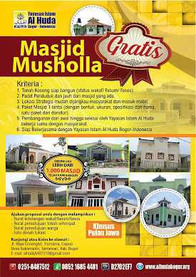 Yayasan Islam Al Huda Bogor – Indonesia membuka Program Pembangunan Masjid & Musholla Gratis bagi masyarakat yang membutuhkan sarana ibadah yang layak. Kami akan membangunkan Masjid atau Mushalla dari nol sampai selesai dan siap untuk digunakan. Silahkan ajukan pembangunannya kepada kami..