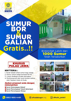Yayasan Islam Al Huda Bogor membuka program Pembangunan Sumur Gratis untuk warga yang membutuhkan. Kami akan membangunkan sumur gratis 100 % dari awal sampai selesai.